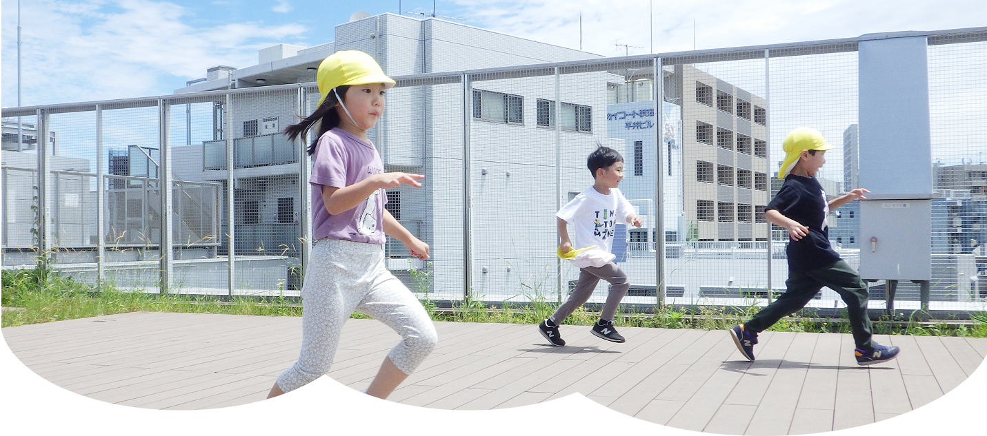 荻窪駅より徒歩3分のところに保育園があり、夏前には屋上の藤の花がきれいに咲いています。春・秋・冬の天気のいい日には、戸外に出て四季の移ろいや自然との触れ合いを楽しんでいます。