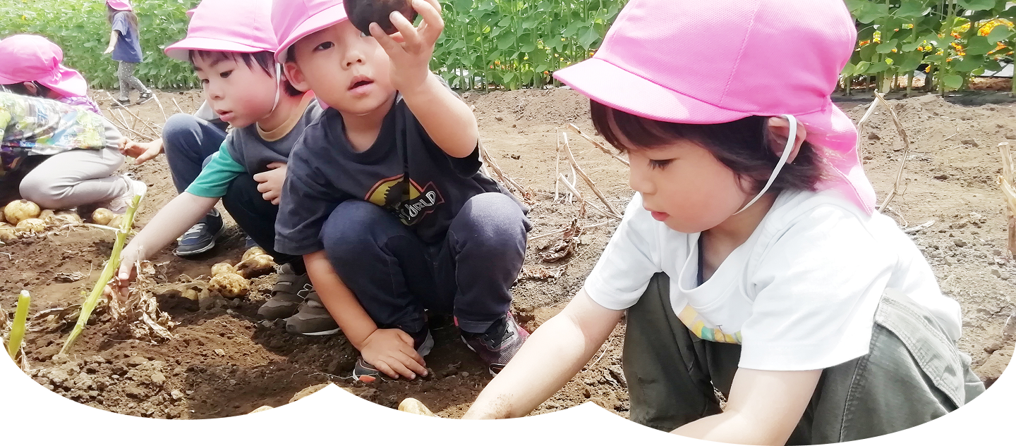 自然に恵まれた環境を十分生かし、農業体験や食育活動など実体験できる生活や遊びを大切にしています。乳児クラスは、少人数の保育を、幼児クラスは異年齢保育を実施。