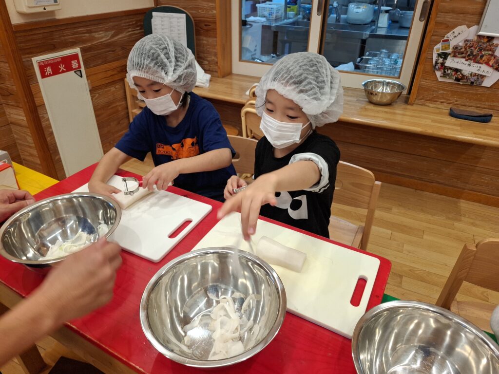 献立では冷製のスープや、冷やしうどん、収穫したキュウリで冷や汁を作ってみんなで涼みました。