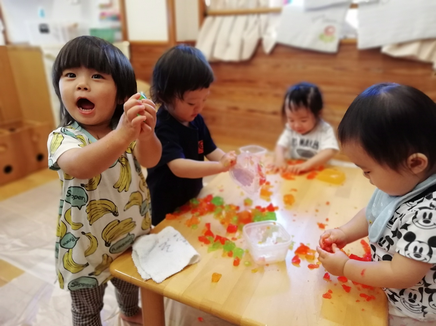 室内で寒天や氷に触るなど、感触遊びを楽しんでいます。