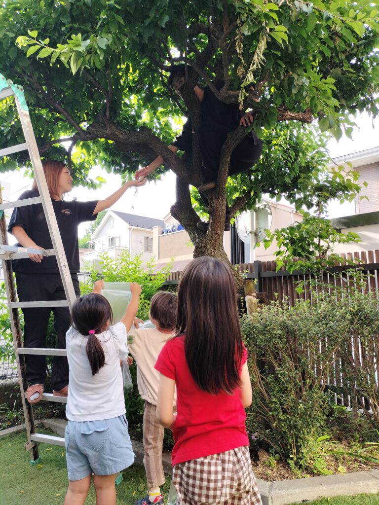 前庭で梅の収穫