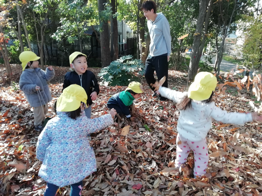 近隣の公園で落ち葉を降らせたり、